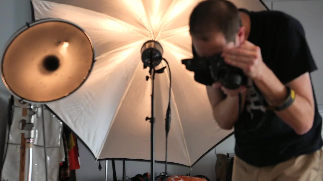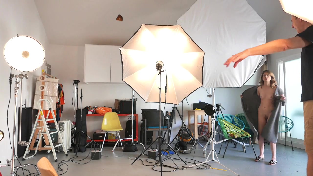 Naked girl posing in the studio. Many different lighting devices and different shooting positions