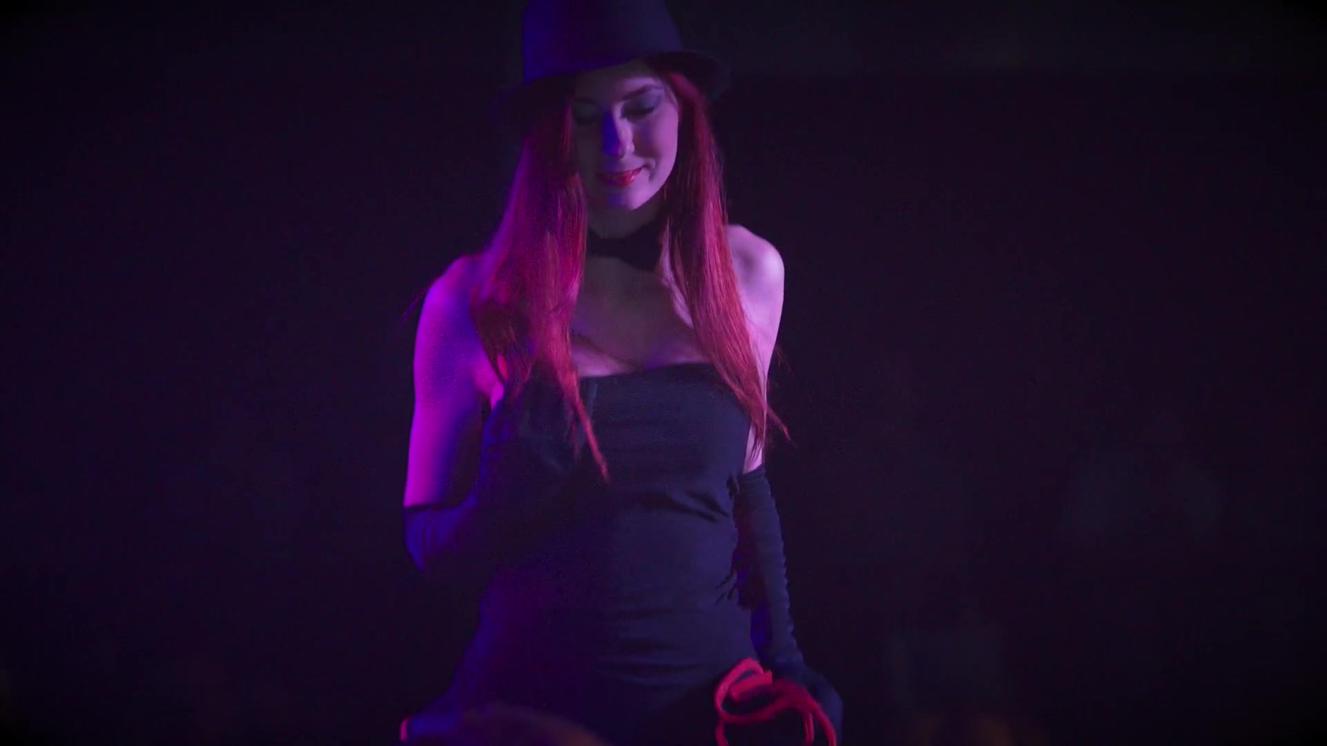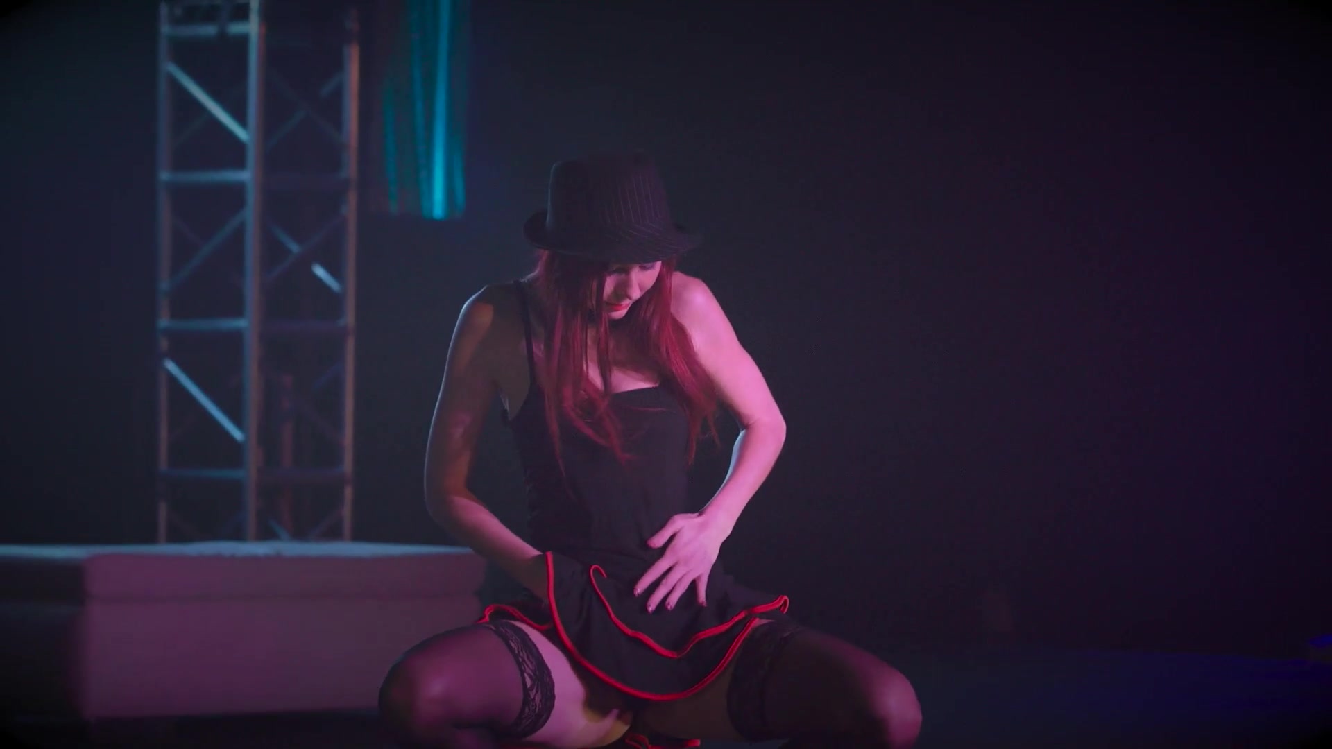 Red-haired beauty reveals boobs and pussy in front of the public. She goes to the music on stage, showing a striptease and caressing her body
