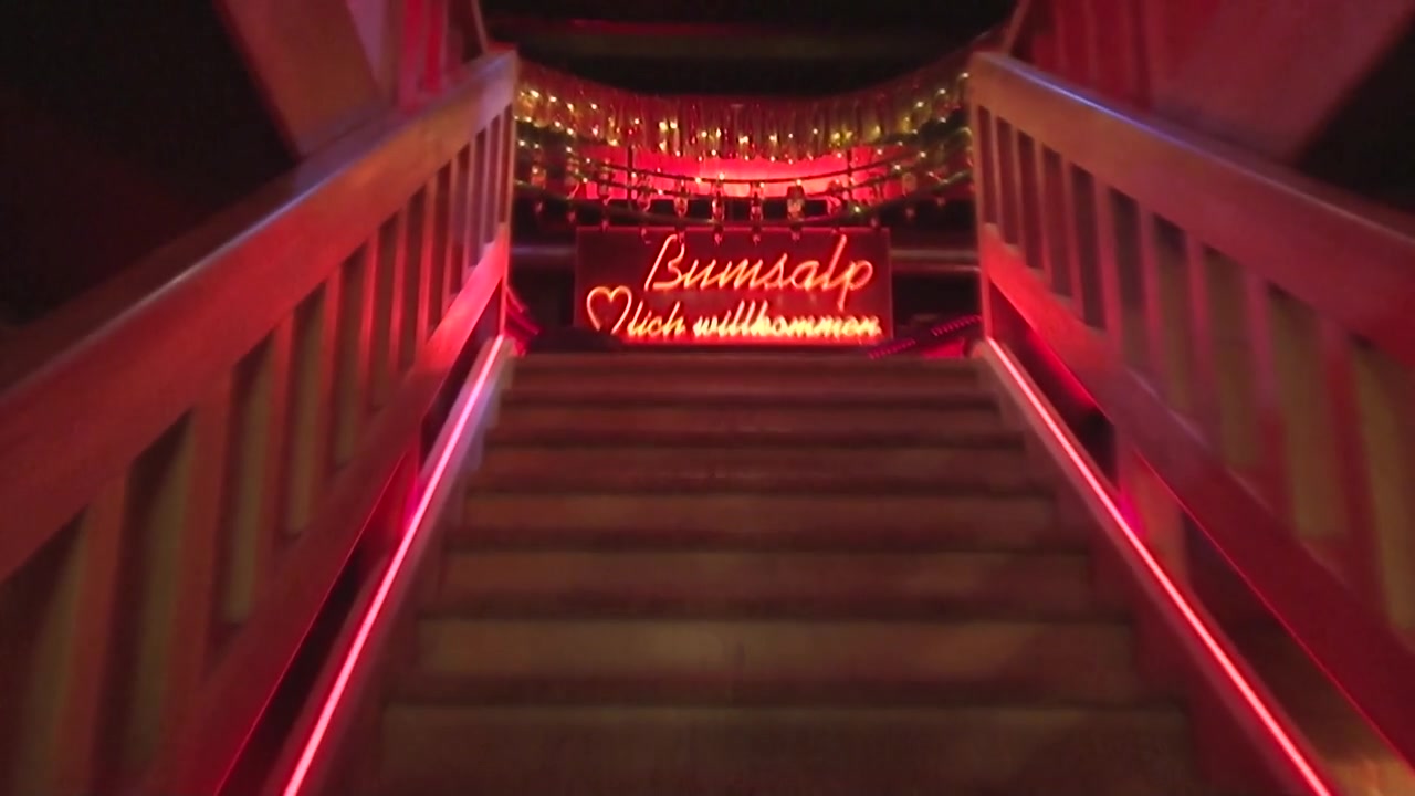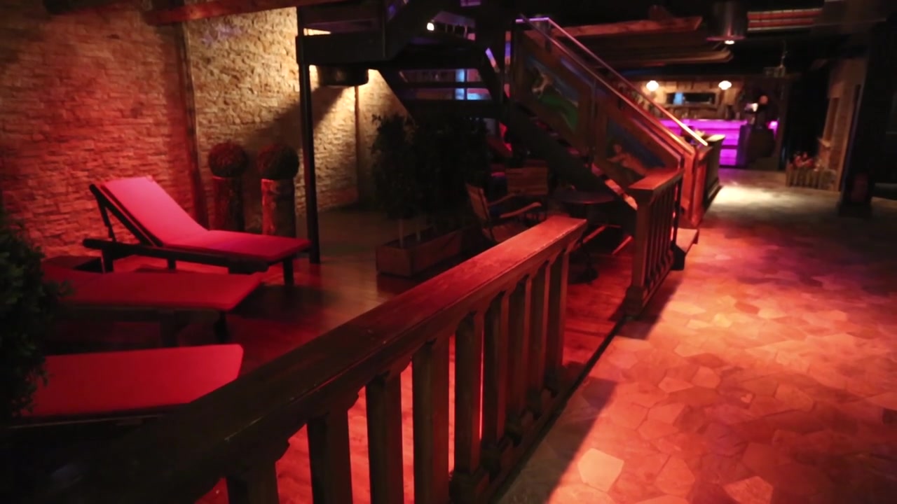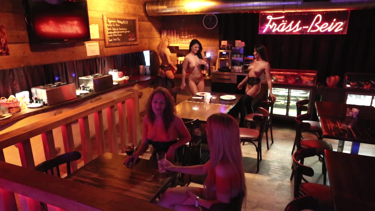 A few young girls are dancing striptease in a bar. Showing tits and caressing each other. Pub and sauna in a shared place