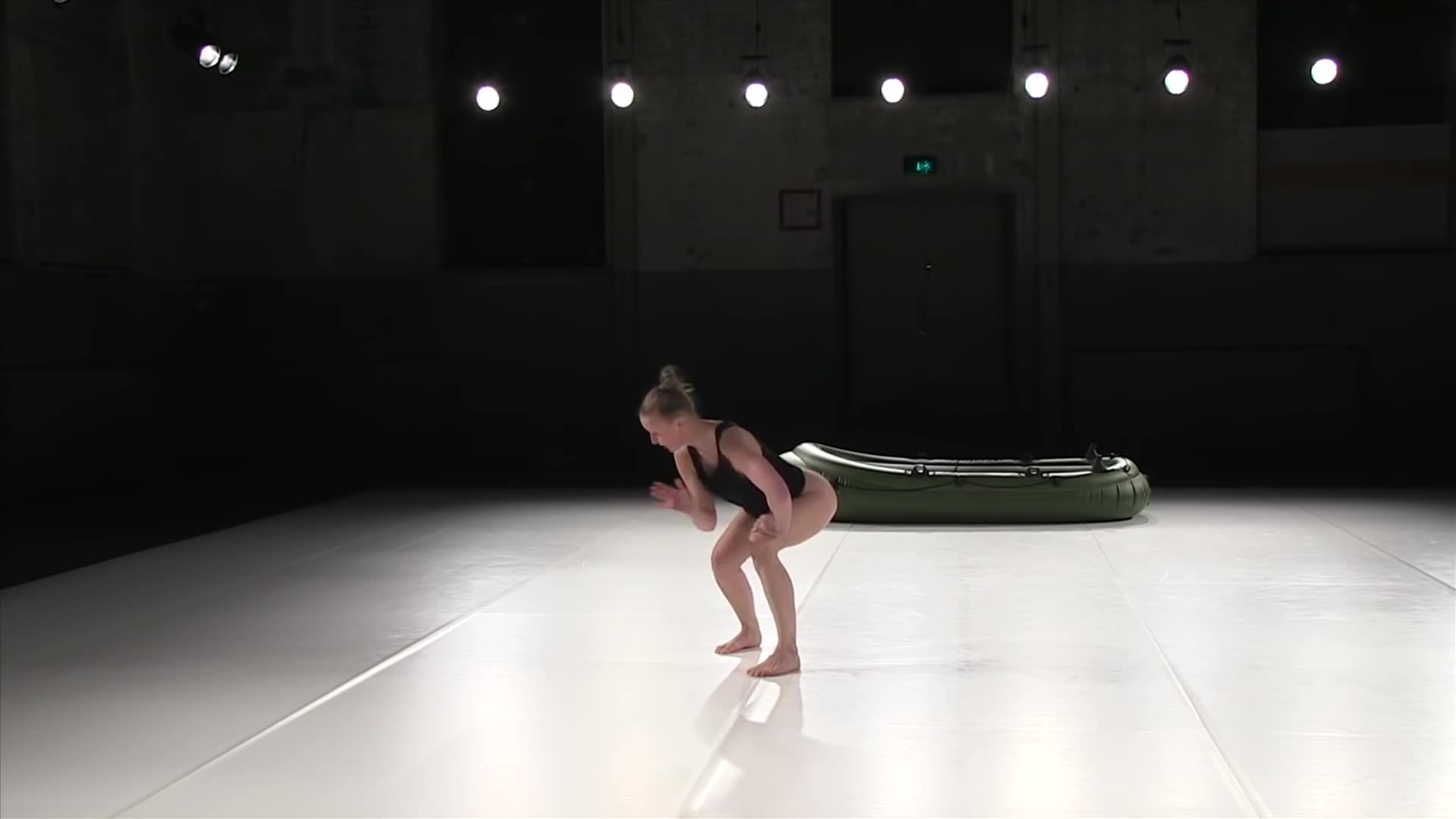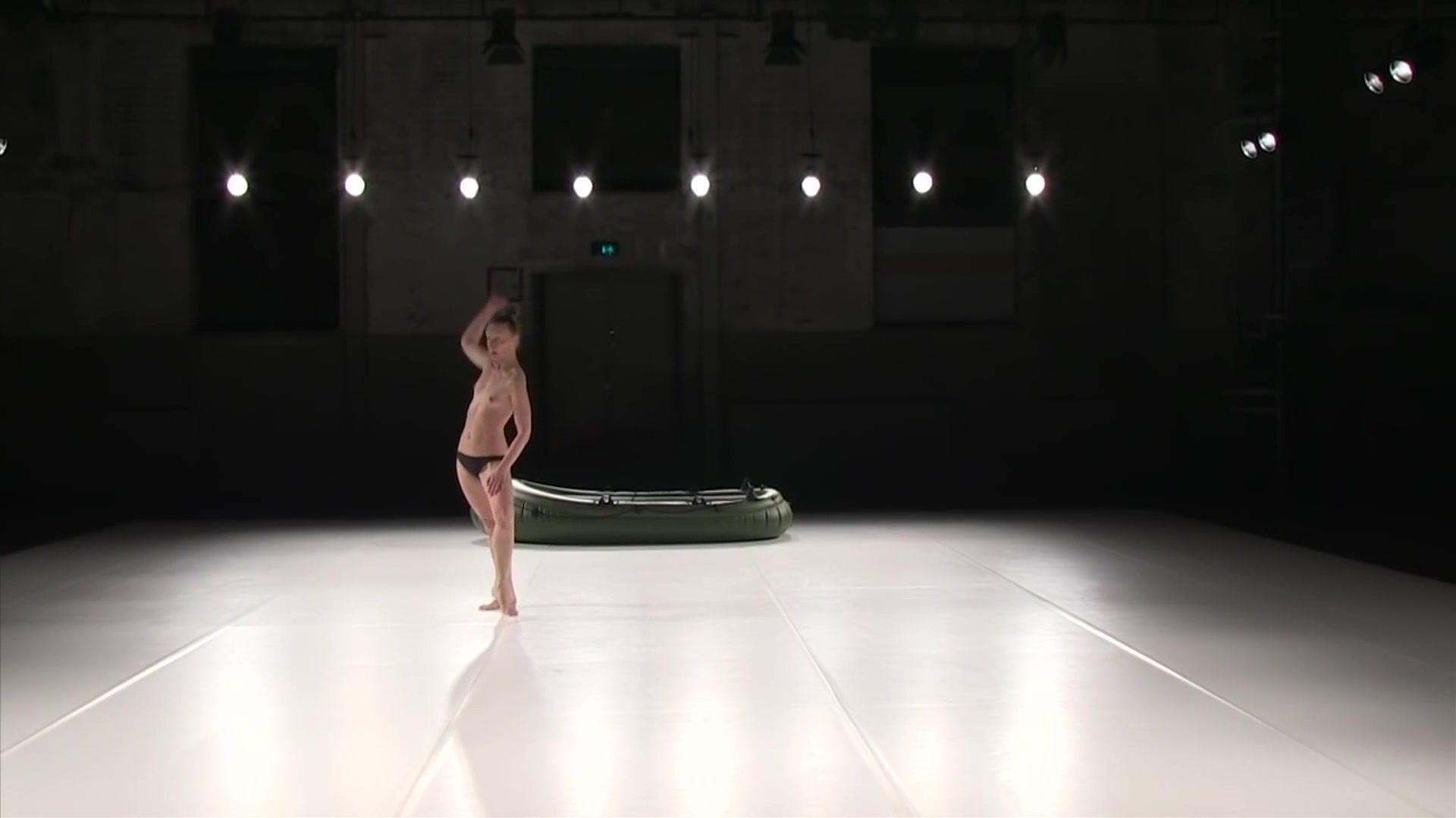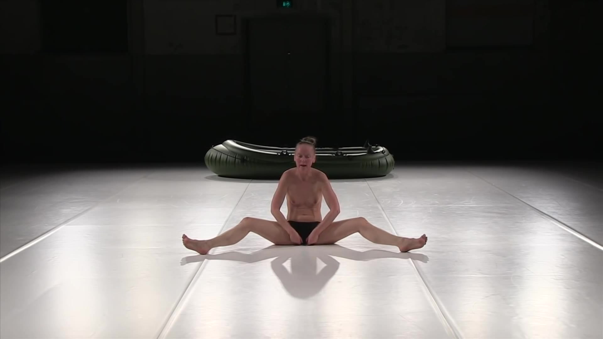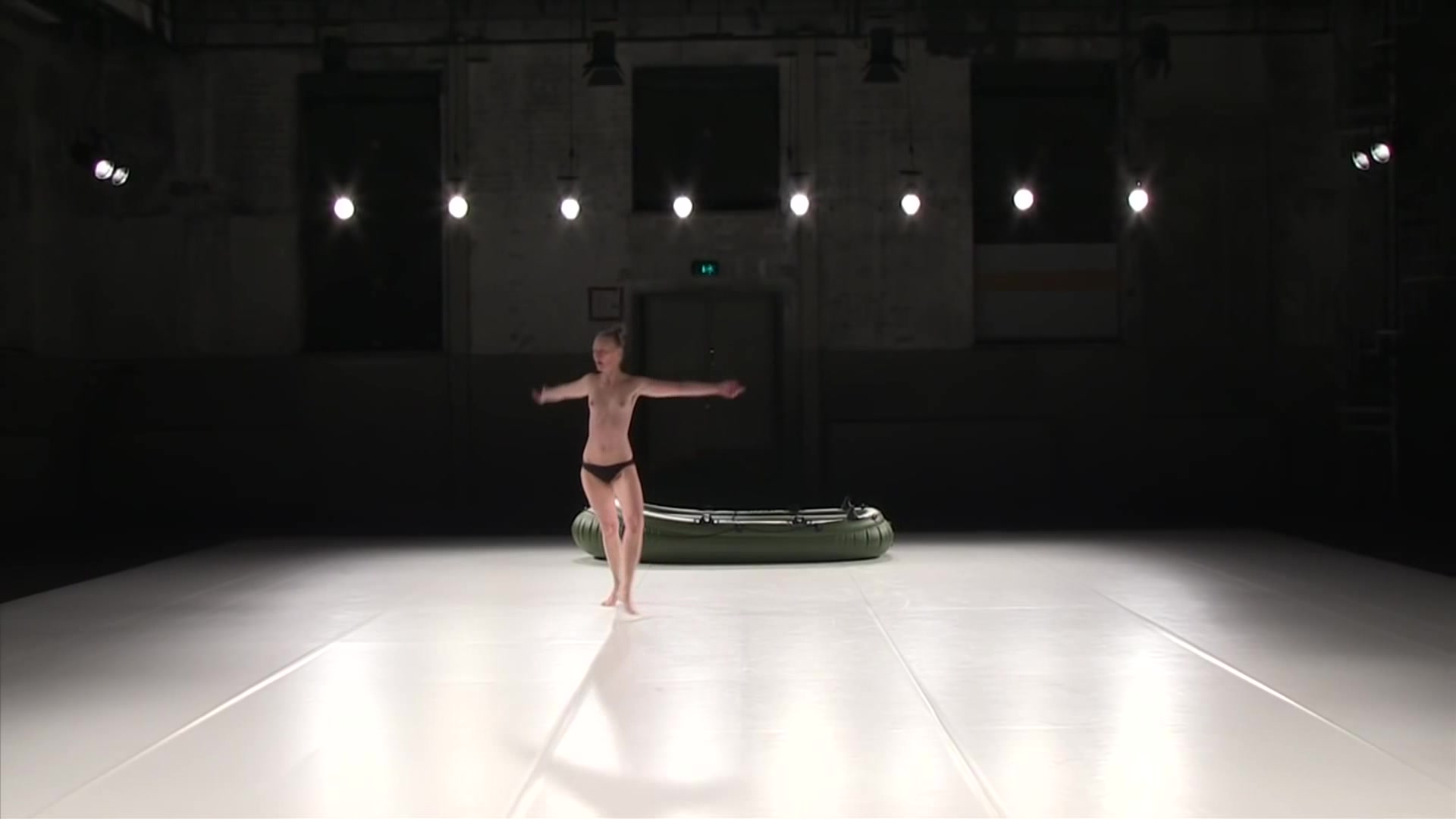 Naked girl from performance. Solo girl on stage with a rubber boat
