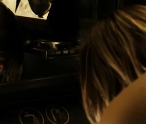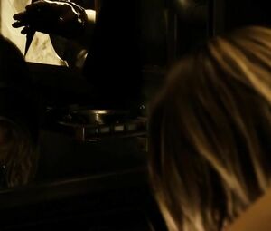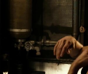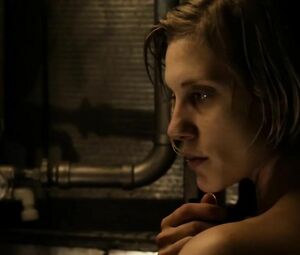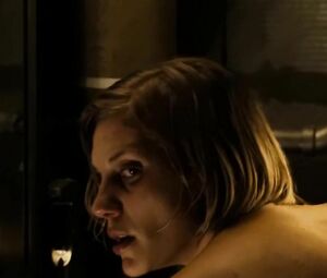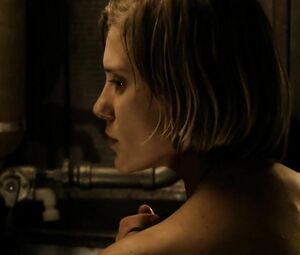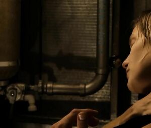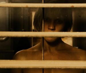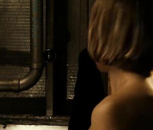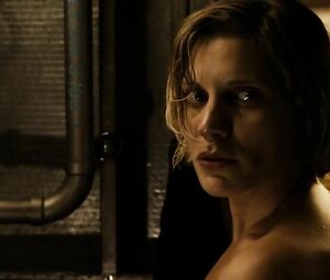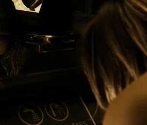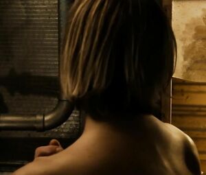 Topless movie star Katee Sackhoff doesn't feel shy to perform the body-washing moment from Riddick (2013) with her boobs naked. She washes the fragile body and dries it with the cloth in front of the mirror.