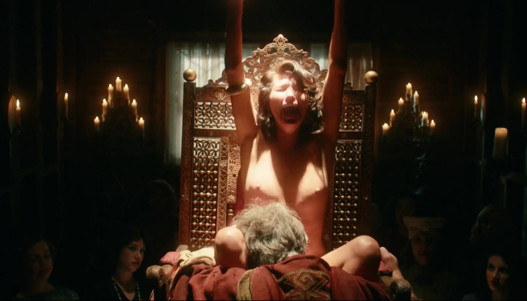 Amara Zaragoza founded her own sect, where her personal morals reign. This whore will sit on the throne and will require one of the men from the parishioners to lick her pussy. While the male will lick Amara's clit, she will loudly preach and seduce the other visitors of the sect. Naked tits of this beauty look just great! Amara doesn't hesitate to appear naked in front of her adepts.